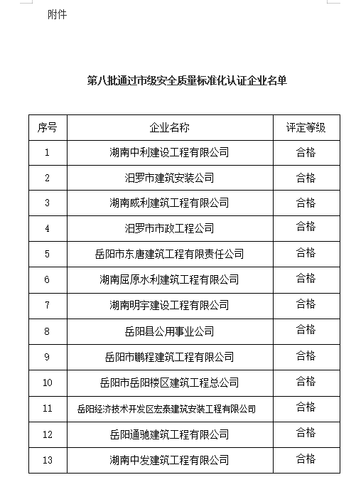 根据省住建厅《关于印发湖南省建筑施工企业安全质量标准化认证实施办法(试行)的通知》【湘建建【2010】228号】和市住建局岳建发【2011】33号文件的规定,在市住建局质安科、监察室、质监处等有关部门的指导监督下,市安全质量标准化认证中心严格按照程序开展了我市第八批建筑施工企业市级安全认证工作。经过组织专家对资料初审、现场核查、项目抽查、社会评价、结果公示,并经市住房和城乡建设局审定后,确定湖南中利建设工程有限公司等13家建筑施工企业为第八批通过市级安全质量标准化认证企业,现予公布。
