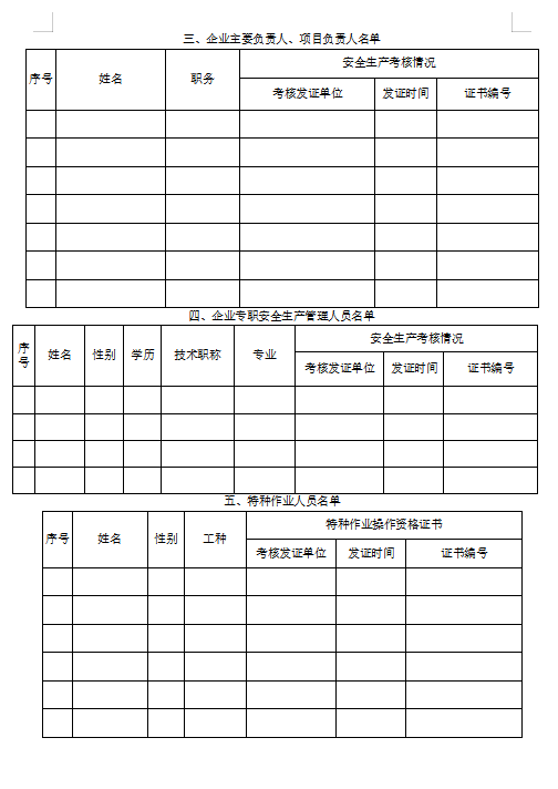 5、《企业在建工程项目汇总表》(附件三)、建设工程安全生产监督机构对在建工程项目的达标验收意见、企业对每个在建工程项目检查的《建筑施工安全检查自评汇总表》(附件四)。